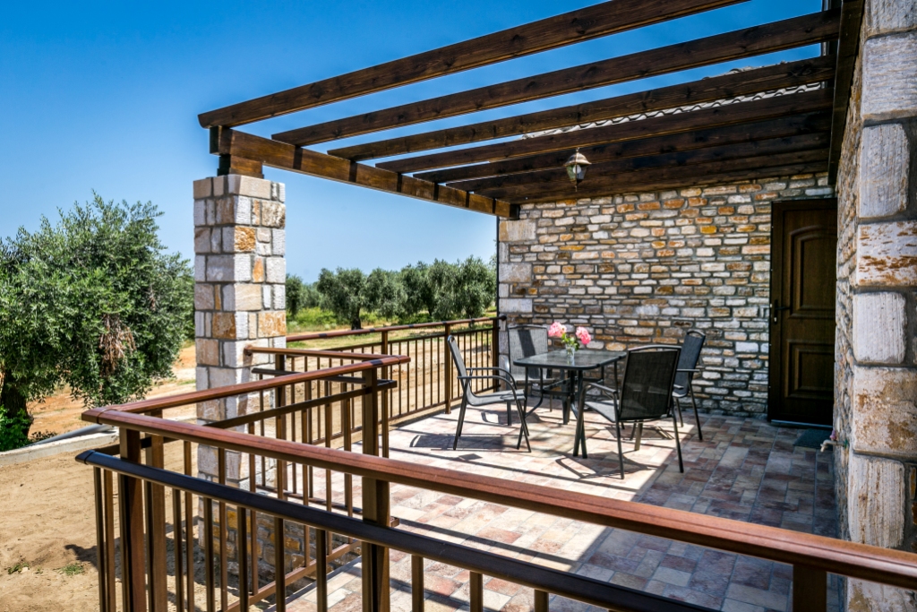 Az új épitésű boungalow/ kőház együttes 2017 nyarától várja pihenni, nyaralni vágyó vendégeit. Limenastól 12 km-re a sziget észak keleti részén Skala Potamias üdülőfaluban található, egy Thassosra oly nagyon jellemző gyönyörű olivaligetben. A házegyüttes 6 db tágas és kényelmes, egyenként 52 m² -es bungalow-ból áll, csendes környezetben ahol a természet szépsége dominál az olivafák mellett a lenyűgöző Ypsario hegy látványával. A környezet hangulatát még tovább növeli a madárcsicsergés és a kabócák éneke.