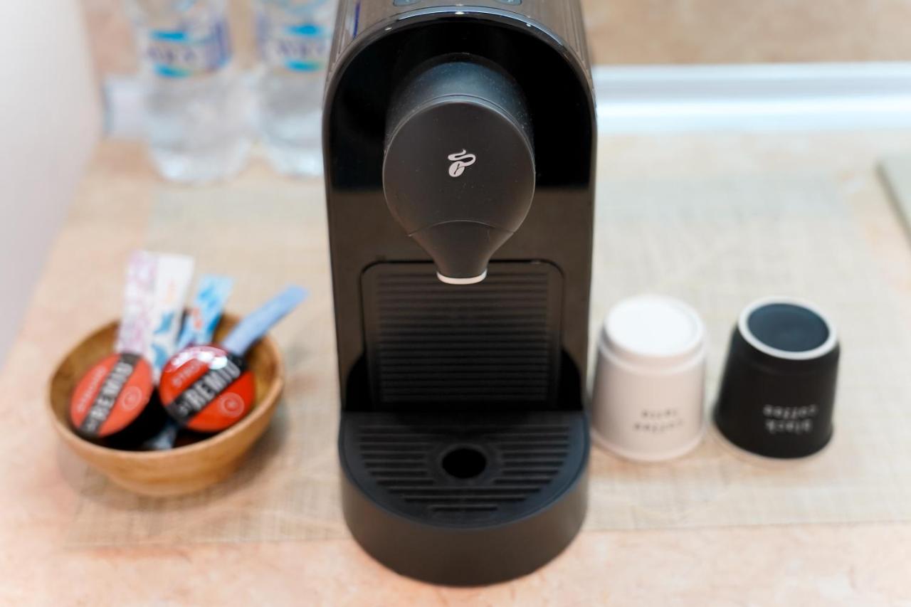 A konyhasarok felszerelt hűtőszekrénnyel, kerámia főzőlappal, kapszulás kávéfőzővel és vizforralóval, alap edényekkel – étkészlettel.