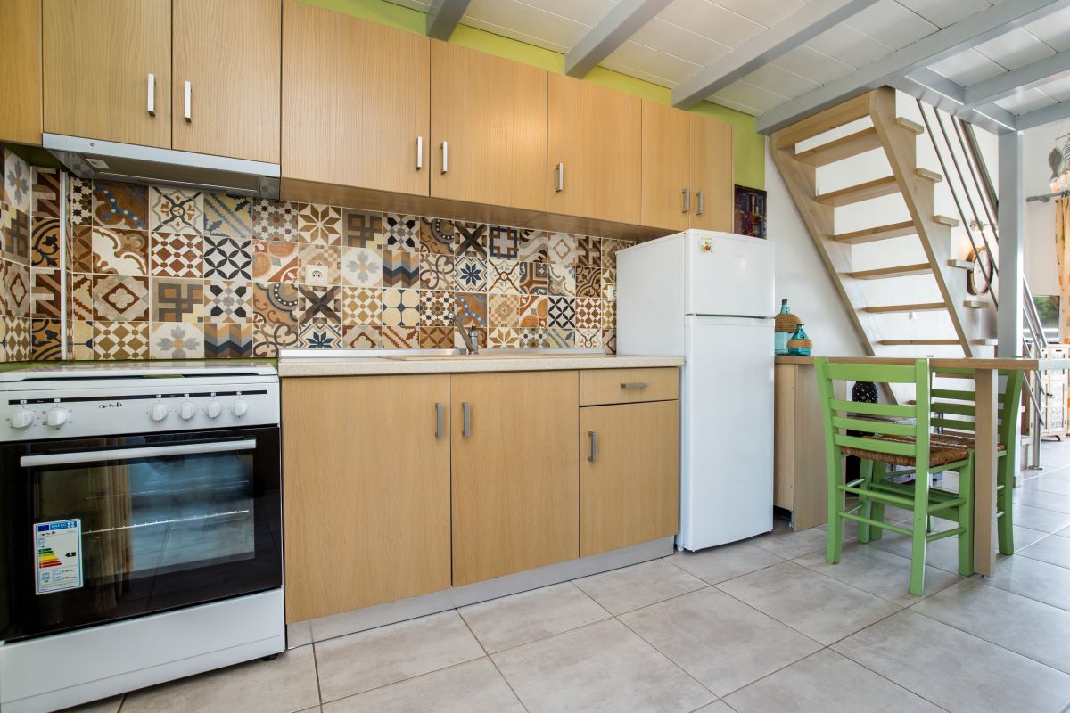 Elrendezése: A földszinti bejárattól rögtön egy belső lépcső vezet fel a lakás nappalijába. Α faltól falig érő hatalmas üvegajtó – mely szúnyoghálóval felszerelt – zavartalan kilátást és bőséges fényt biztosit. A nappali egy kinyitható kényelmes kanapéággyal rendelkezik 2 fő részére.