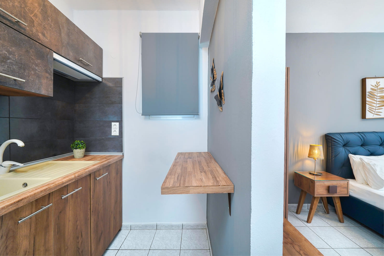 A stúdiókban egy szabványos hűtőszekrény fagyasztórésszel és egy alap felszerelt konyhasarok található egy főzőlappal.